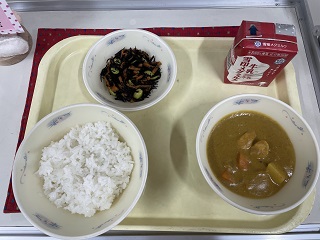 今日の献立は、ごはん、牛乳、チキンカレー、ひじきのソテーです。