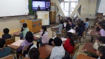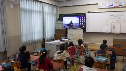 22日(月)、オンライン朝会を行い、校長先生から6年生の代表児童にグローブが授与されました。