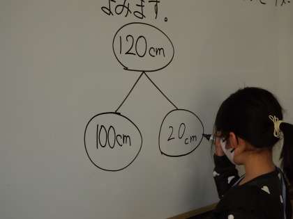 その後、100cmの別の表し方「1m(いち・メートル)」を使って長さを表しました。