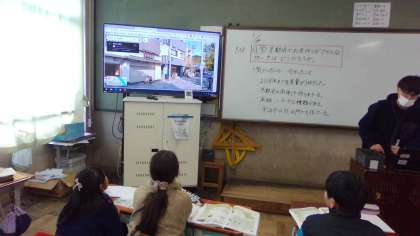 京都府でお茶づくりがさかんな地域について学習しました。京都は宇治茶が有名で、和束町や南山城村、宇治田原町など南部地域で作られていることや、宇治茶の中でもいろいろ種類があることなどがわかりました。ストリートビューで、宇治市の平等院鳳凰堂へ向かうと、宇治茶のお菓子やお茶のお店がたくさんあり、子どもたちは驚いていました。