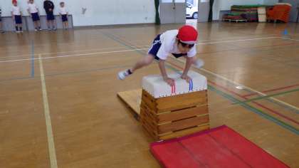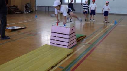 踏み切りでしっかり両足ジャンプ,手は奥につける,着地まで美しくを意識して自分にあった跳び箱で挑戦しています。良いイメージで跳べるように,上手な子どもの跳び方をよく見てから活動するようにしています。