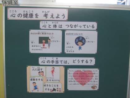 保健室前の掲示板、今月は「心の健康」がテーマです。心と体はつながっています。そのため、疲れたときやしんどいときには、心の手当ても必要です。友達や家族や先生に聞いてもらったり、運動したり、早めに寝たりする等して、心も健康に過ごしましょう。