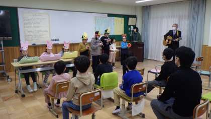 交流あそびではまず,大藪小学校のみなさんが「山のおんがくか」の歌と合奏を披露してくれました。3匹の動物に分かれて,リコーダー・鍵盤ハーモニカ・タンブリンの3つを演奏してくれました。みんなが知っている歌で,聞いているほうも思わず歌いだしそうになるくらい素敵な歌と合奏でした。
