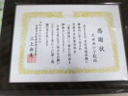 この度、京都市学校薬剤師会より学校へ「感謝状」をいただきました。これは、本校の5.6年生が京都市学校薬剤師会主催の「薬の標語」に応募させていただいたことによるものです。ありがとうございます。日頃から、薬のことだけでなく、健康に関心をもって保健活動を進めていきたいと思います。