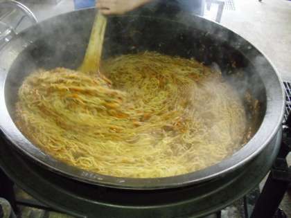 給食室ではできたてのスパゲティを提供できるように給食開始時間の