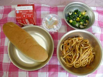 スパゲティのミートソース煮,ほうれん草のソティ,りんごゼリー