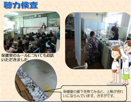 最初に養護教諭から、保健室の使い方やマナーの話のあと、検査を行いました。