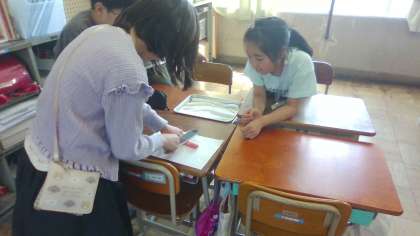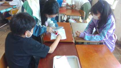 ラミネートフィルムで作った包丁で小麦ねんどを切りました。大事なことは、左手のゆびを丸めること、つまり「ねこの手!」ということを確認しました。次回の調理実習ではこの経験を生かして無事に材料が切れますように。