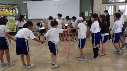 体ほぐしの学習で、フラフープくぐりをしている様子です。