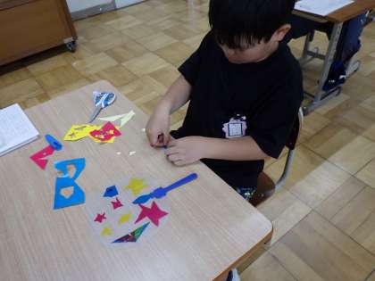 図工では、ステンドうちわを作りました。まずどんなうちわを作りたいかデザインを描き、セロハンシールをその形に切って、うちわに貼り付けていきました。セロハンが透けているので、違う色を重ねると別の色になるので、工夫して貼りました。それぞれ個性豊かなうちわを作ることができました。