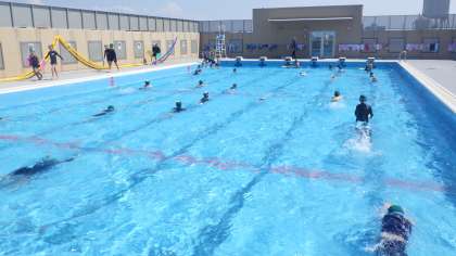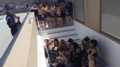 ついに今年度の水泳学習がスタートしました。子どもたちは、朝から楽しみで仕方なかった様子!