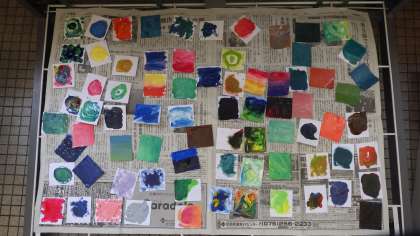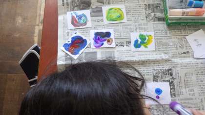図画工作科では、「色合いひびき合い」という題材で、色が混ざる一瞬の美しさを捉えて色カードを作り、できる色や形の感じを楽しみました。