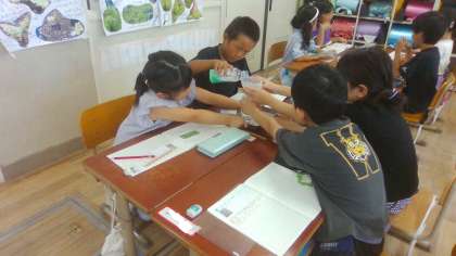 今日の算数は、かさくらべをしました。一方の容器の水をもう一つの容器うつしかえて、どちらの方が多く入るかを調べました。「実験みたいで楽しい!」「違うやりかたでも調べてみたい!」など、とても楽しく学習ができました。