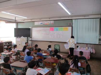 各クラスで読み聞かせを聞き、場面ごとの出来事や登場人物の動きや表情などを確認しました。