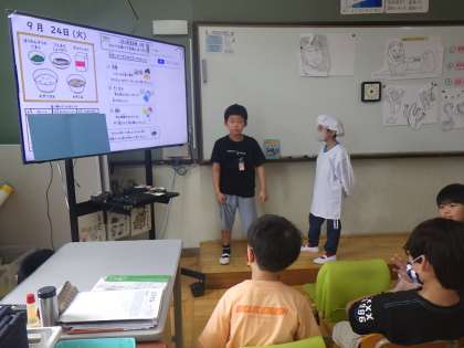 さくらでは、給食室に給食を取りに行く前にみんなで集まって今日の献立を確認したり、食べ物のクイズをしたりしています。食べ物クイズは、日直が前に出て食べ物の3つのはたらきについてクイズを出しています。楽しんで取り組んでいる子どもたちです。