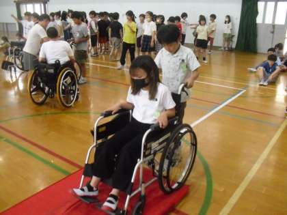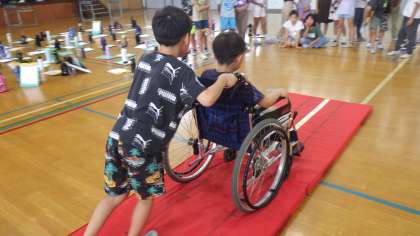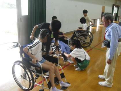 車いす体験の様子です。車いすの組み立てから自分たちで体験します。