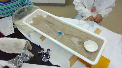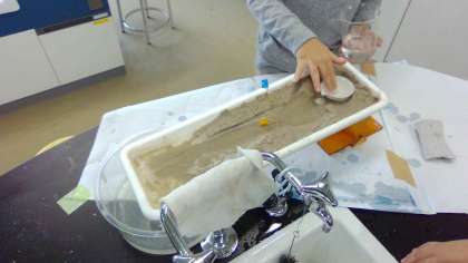 『流れていく水には,どのようなはたらきがあるのだろうか』を学習問題にすえて取り組んでいます。この時間は,プランターの受皿を使って地面を作り,川のように流れる装置で実験しました。