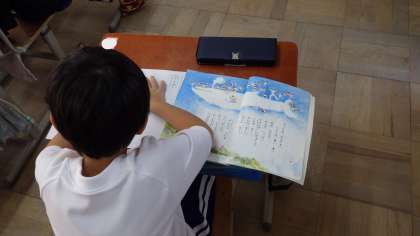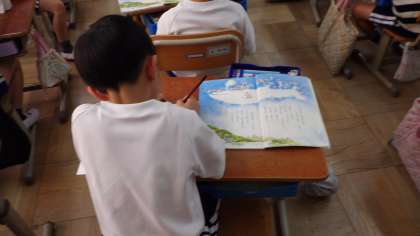 お話の内容を確かめたり,文から話していることを想像したりしています。
