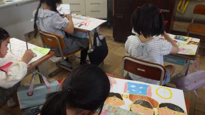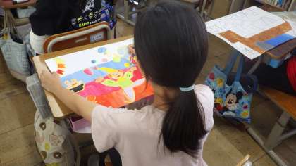 書きたい場面を決めて下書きをし,丁寧に色を付けていきます。背景の色遣いや色の変化にも気を配りながら着色する様子が素敵です。