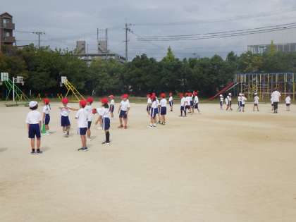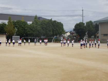 今日から運動場で練習を始めています。