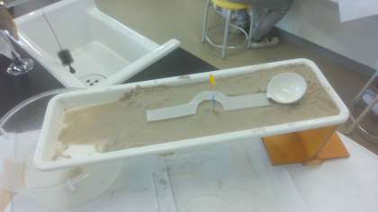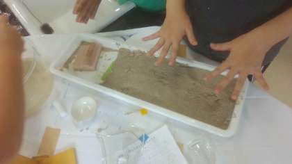 理科の学習「流れる水のはたらき」では、土の入った実験セットを傾け、水を流しました。直線やカーブなどの、水が流れるコース作りを行い、カーブで水の流れによって削られた土はどこに溜まるのかを考えました。実験後には、流れる水には、地面を削ったり、土を運んだり、積もらせたりする働きがあることを知りました。