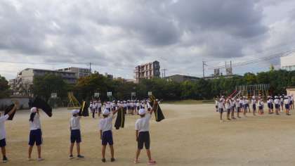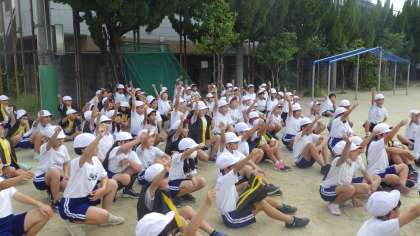 手の伸ばしかた,移動の仕方,今までに練習したことを復習しつつ,より良い演技を目指して練習を重ねています。掛け声のタイミングも確認して,かっこよくそろえることができるように頑張っています。