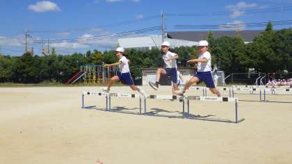 スポーツDAYで,4年生は民謡だけでなく,ハードル走にも取り組みます。「トン・1・2・3」のリズムで飛ぶことや,低い姿勢のまま頭の位置を変えずに走ることを意識しています。