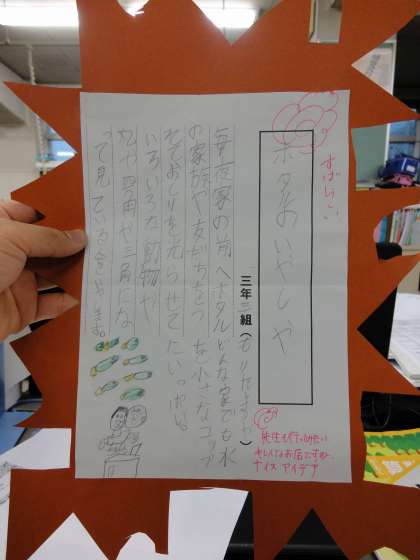 国語の授業で「きつつきの商売」の看板つくりを行いました。動物になったらどのような商売がしたいかをプリントに書き、枠を画用紙で自由に切り上手なお店の看板で出来ました。「ほたるのひかりや」「いぬのかいけつや」など楽しい内容のお店がたくさんあります。自由参観の時に、ぜひ、見てください。