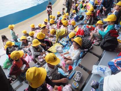 水族館につき,イルカショーの場所で少し早めにお弁当を食べました。