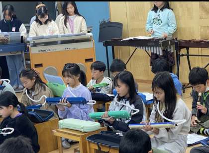 音楽で練習してきた、キリマンジャロの合奏を、2クラスずつ聞き合いました。同じ曲なのに、クラスごとに感じが違って、とても素敵でした。同じ楽器の友達に注目して聞いている子もいて、自分が演奏するのとはまた違う音の楽しみを味わいました。