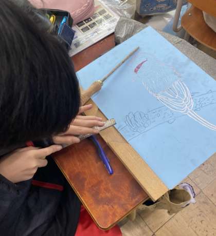 下絵の細かい線が重要なので、題材の写真をよく見ながら、細かくスケッチしました。早い子は彫りに入りました。