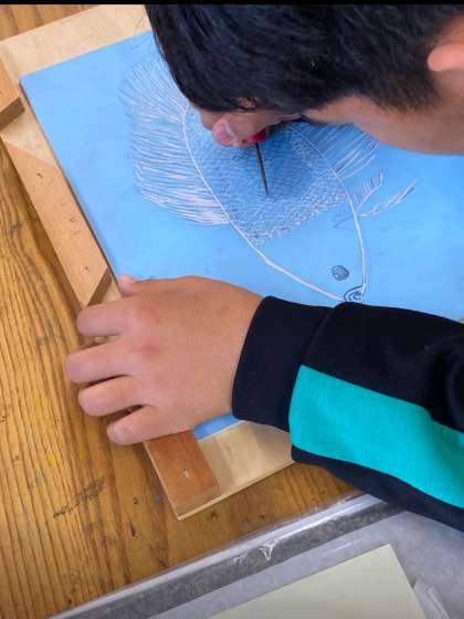 版画では、彫刻刀以外のきりなども使って線を刻み込んでいる児童もいます。どんなふうに刷り上がるのか楽しみですね!
