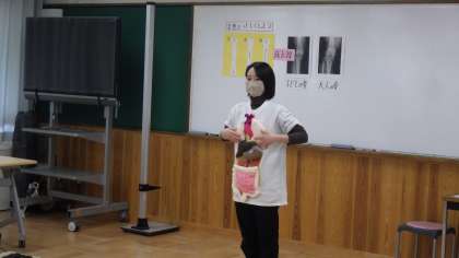 姿勢のよさは成長にとってすごく大切なものです。姿勢が悪くなってしまうとどうなるのか,模型を使って見せていただきました。体感を鍛えるトレーニングをすると,意外と難しい!との声もありました。ぜひ,お家でも実践してみてくださいね。