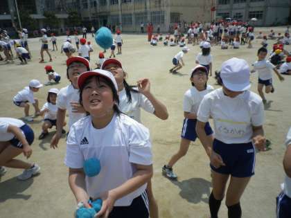 自分のペアの子と仲良く手をつないで入場です。1年生も6年生もみんな必死です!当日は,1年生が籠に入れた玉数と6年生が籠に入れた玉数を足して競争します。競技の結果とともに,子どもたちが1年生をリードする姿も楽しみにしてあげてください。