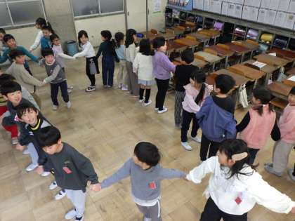 その後、4人→8人→16人とだんだん手をつなぐ人数が増えていき、最後は全員で一つの輪になって挑戦しました。