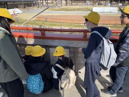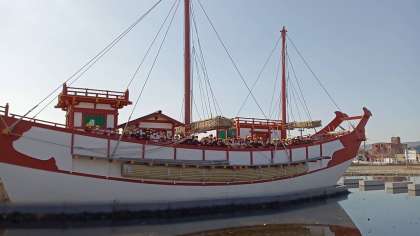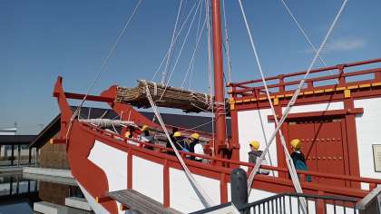 船に展示してある資料を見ながら、遣唐使船の中を探検しています。