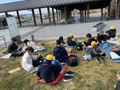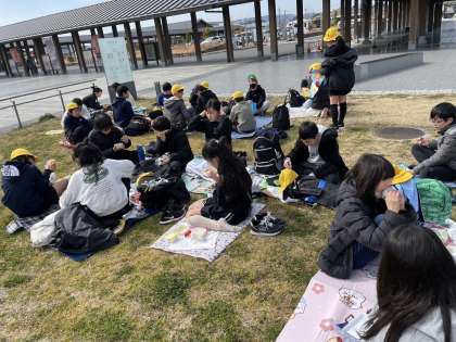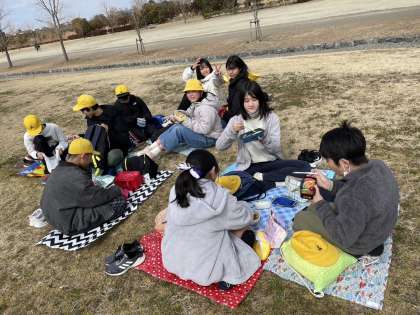 気温も上がってきたので、予定通りレジャーシートを敷いて外で食べています。