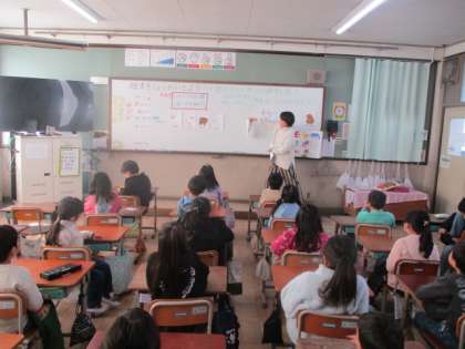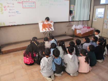 2年生では、英語活動で「絵本をしょうかいしよう」の学習をしています。