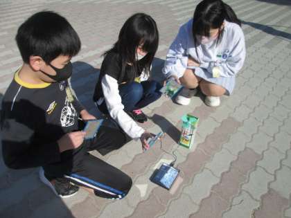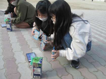 この日は晴れていたので、「昼休みに実験をしたい人は運動場に集合!」と声をかけると、友達と一緒に実験を楽しむ姿が見られました。