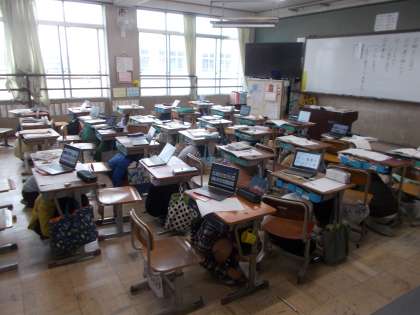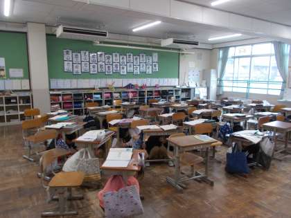 シェイクアウト訓練用アラームが鳴ると,どのクラスも緊張感をもって頭と体を守って静かに避難する姿が見られました。