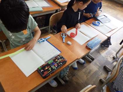 ものさしを使わずに紙テープを切って、誰が10cmの長さに近いか挑戦しました。