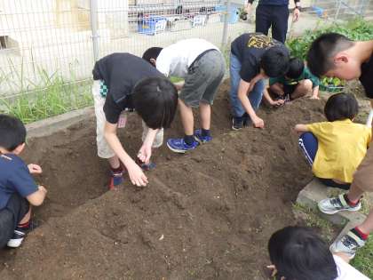 草取りをした後に肥料をまき,丁寧に苗を植えました。
