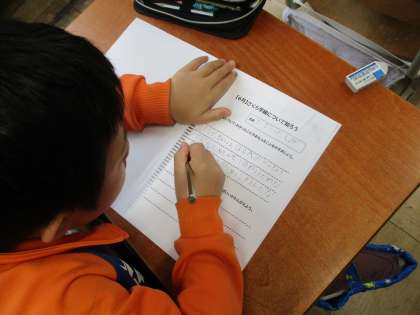 振り返りには、「人によって得意なことも苦手なこともある。なやんでいたら声をかけてあげたい。」「仲良くなるためには、自己紹介をしたり、すきなこと・苦手なことを伝え合ったらいいと思う。」と書いていました。
