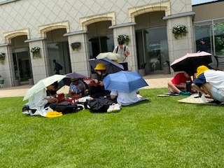 みんな傘をさしています。雨?いいえ、急に太陽が顔を出し、暑くなってきました。日差しを避けるために、傘をさしています。