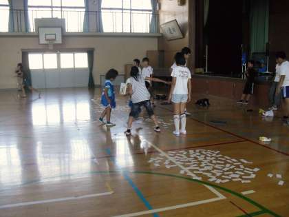ペアでカードの所まで行き,そこで引いたお題に合うものを探してバトン代わりに次のペアに交代する・・・という競走です。