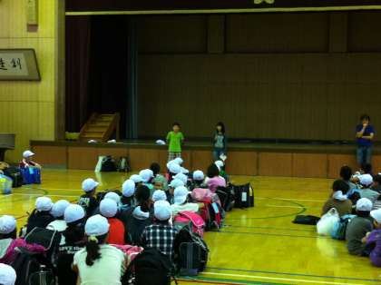 体育館で出発式。進行係の子どもたちがしっかり進めてくれました。