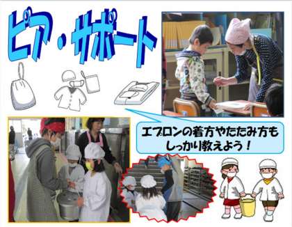 1年生教室に行き、給食当番や給食準備のサポートをしています。