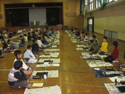 正座でしっかり半紙を押さえ,心こめての「友だち」。