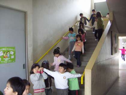 まず給食室。月曜から給食が始まります。そのときお世話になる部屋です。続いて体育館。入学式で使いましたが,今は長いすもなく広いところ。入るなり走り回っていました。保健室,けがをしたりやしんどくなったりしたときに利用します。職員室…担任の机の場所なども知りました。2階へ行って音楽室と校長室。最後に運動場に行きました。