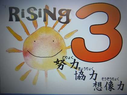 学年目標は,学習や生活面など様々な面で3年生の力を上昇させていきたいという願いを込めて「RISING 3〜努力・協力・想像力〜」です。